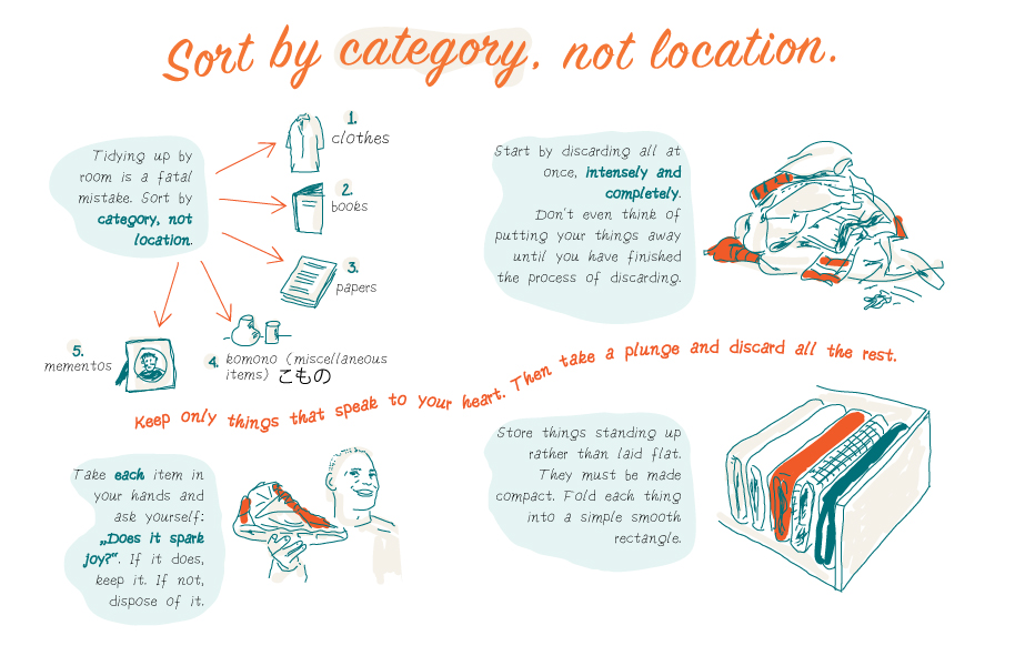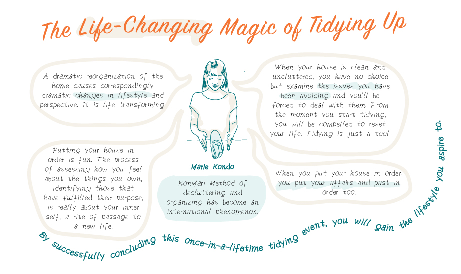 Japanese cleaning consultant Marie Kondo takes tidying to a whole new level, promising that if you properly simplify and organize your home once, you’ll never have to do it again. Most methods advocate a room-by-room or little-by-little approach, which doom you to pick away at your piles of stuff forever. The KonMari Method, with its revolutionary category-by-category system, leads to lasting results.